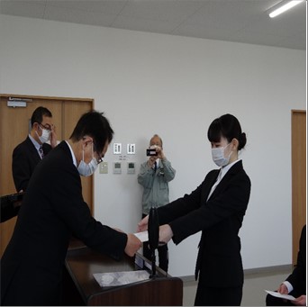入社式は新潟本社と関東入社式会場をオンラインで繋げ、関東の新卒者は、本社にて五十嵐社長よりお一人お一人辞令をお読みいただき、関東入社式会場で大谷常務取締役から、辞令をご本人へお渡ししていただきました。